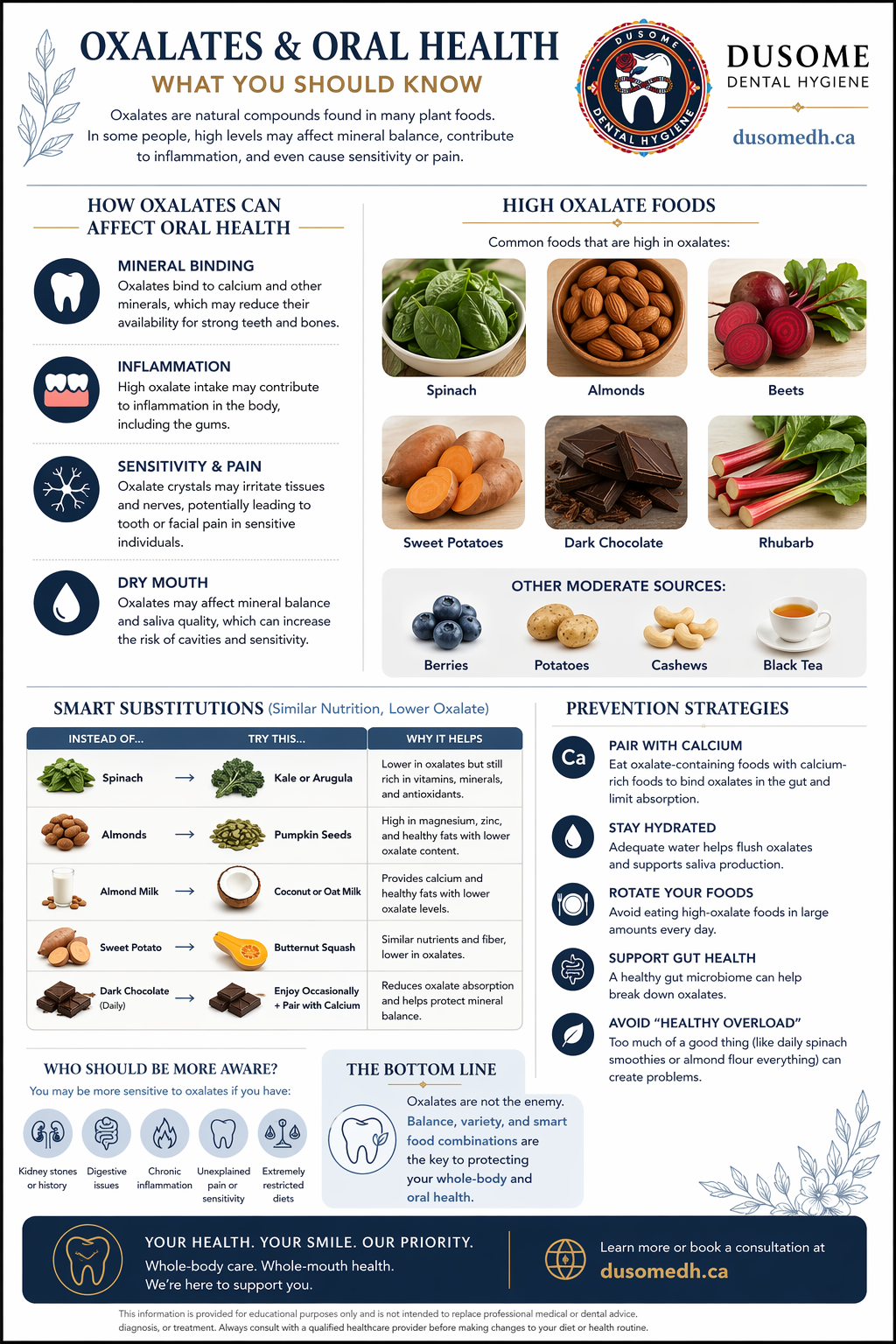 This content is provided for educational and informational purposes only and is not intended to substitute professional medical or dental advice, diagnosis, or treatment. Individual health needs vary. Always consult with a qualified healthcare professional before making changes to your diet, supplementation, or oral health care routine. Dusome Dental Hygiene provides guidance within the scope of dental hygiene practice.